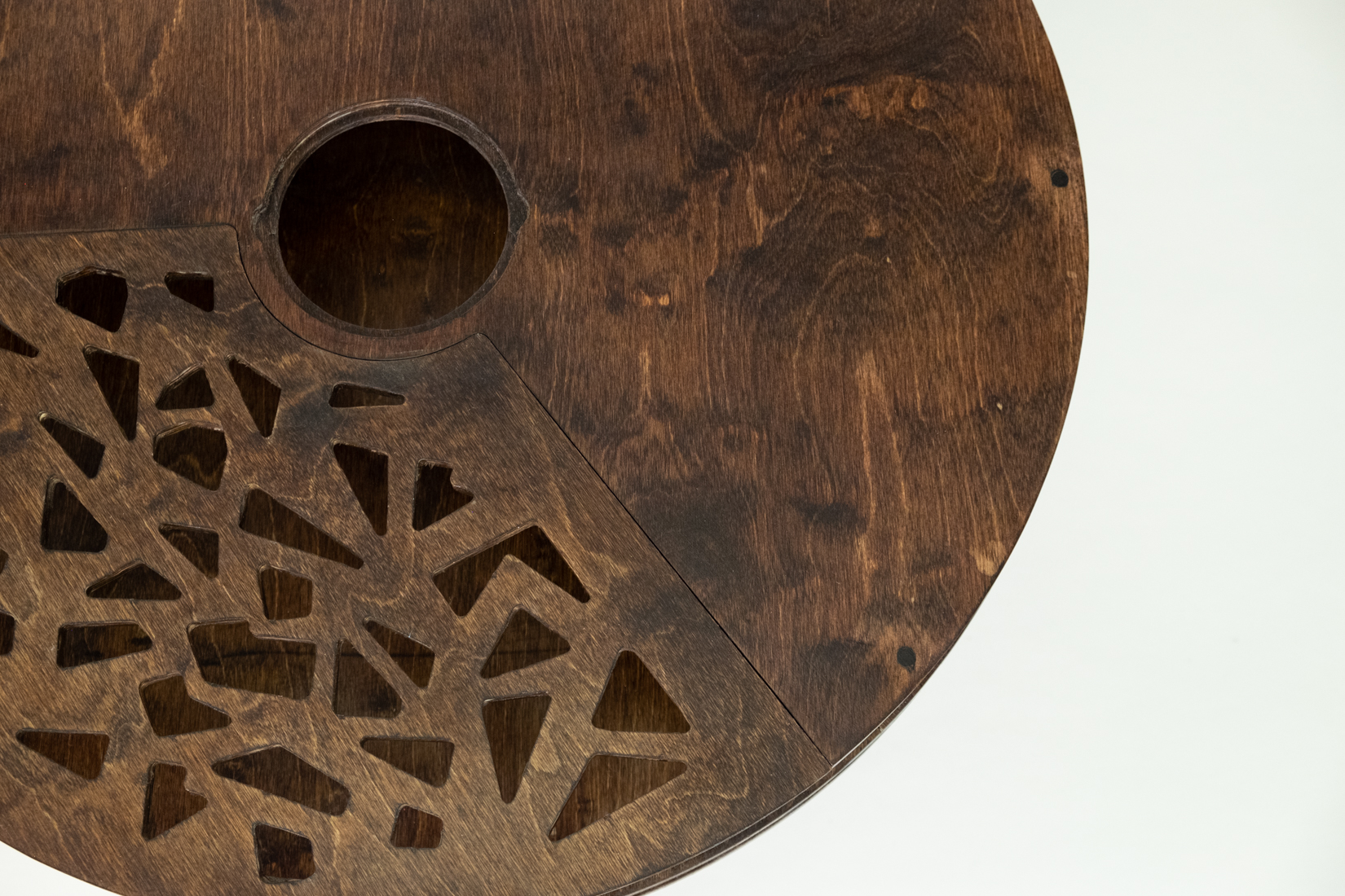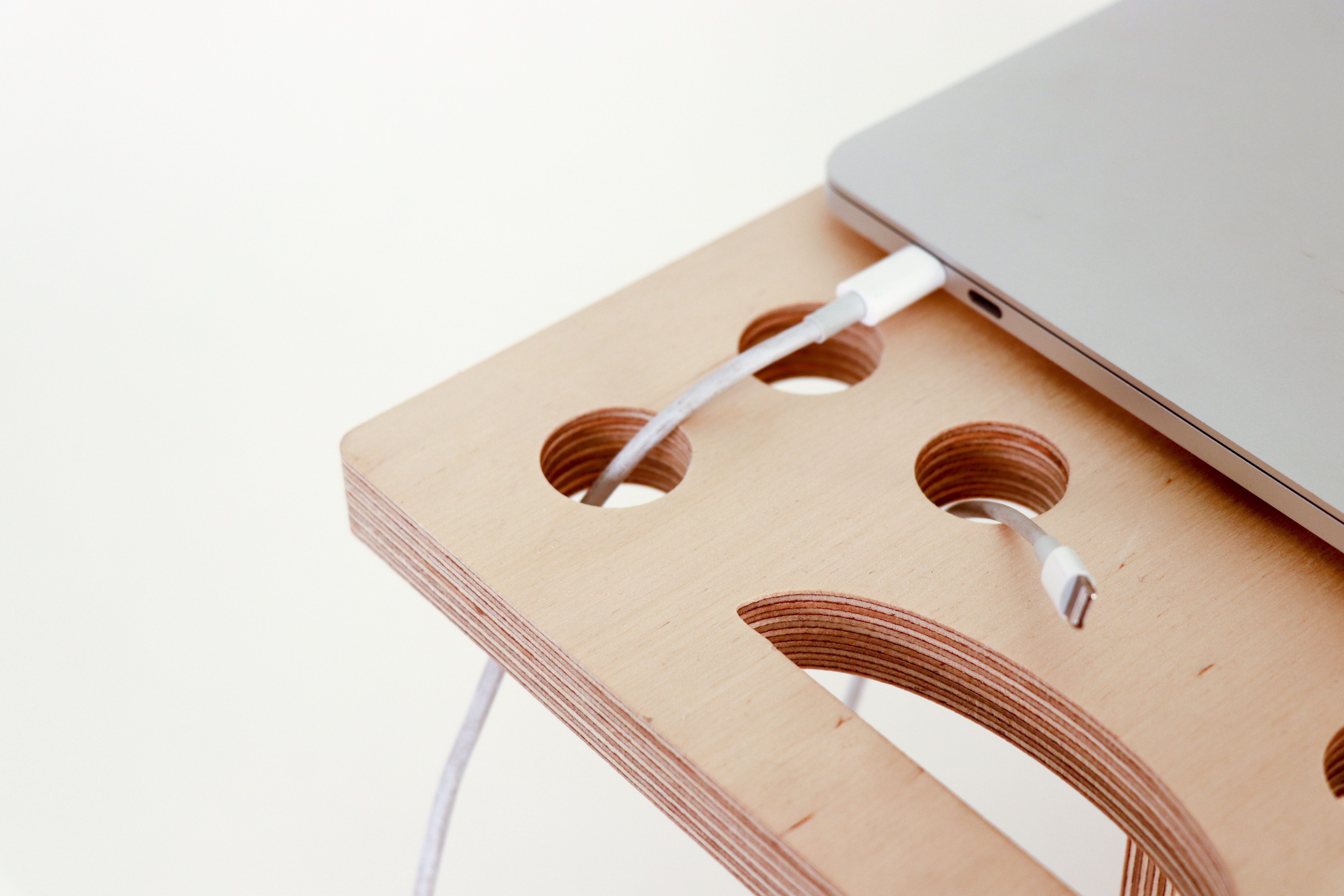 The standing desk consists of a three piece puzzle made out of high quality plywood from the CNC machine with no glue or screws required with the intent to design for disassembly. I designed the standing desk to incorporate holes for computer ventilation, organization of wires, and to minimize weight for transportation purposes.