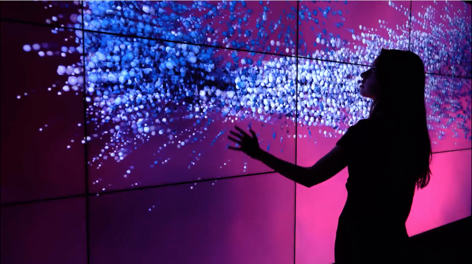 Commissioned by Concordia University as the inaugural piece for the newly built Visualization Studio, Proteus is an interactive public installation which creates a sense of wonder and immersion through interactions with a mysterious and dynamic particle system.