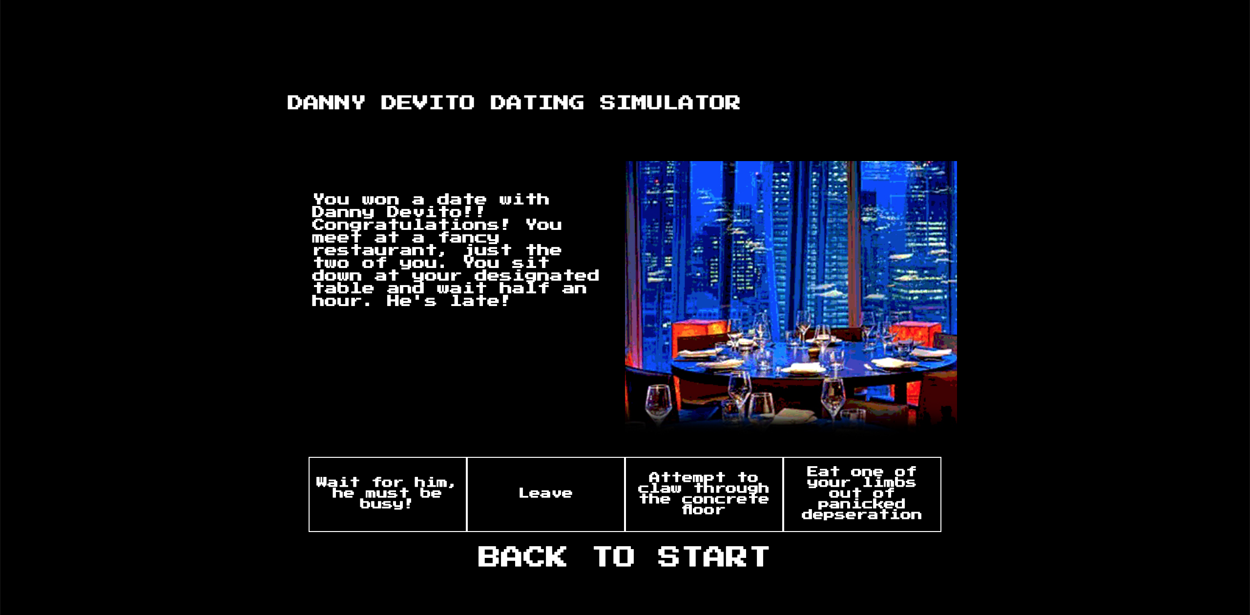" Wow! Dating Simulation 98 est une expérience de dating basée sur le vieux médium du CD-ROM, qui n'a jamais été publiée auparavant, selon les archives Geocities de Wayback Machine. Tous les exemplaires ont été rapidement détruits par le PDG et fondateur de General Mills (TM), Tilt Maximum, en 1997. Le voici, maintenant, pour votre plaisir.