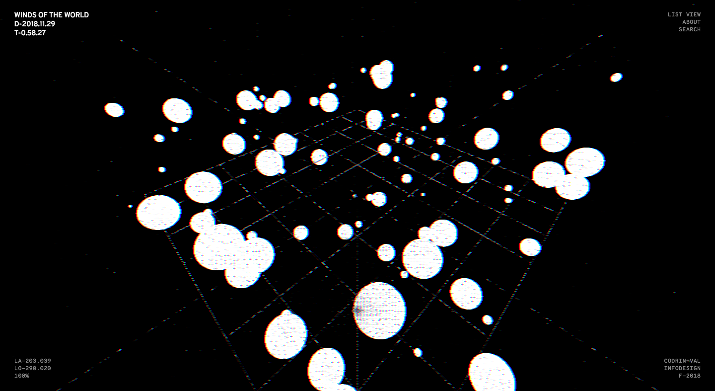 Winds of the World est une application WebGL interactive permettant de visualiser la vitesse, la température et les conditions météorologiques du vent à travers une interface abstraite et minimaliste.